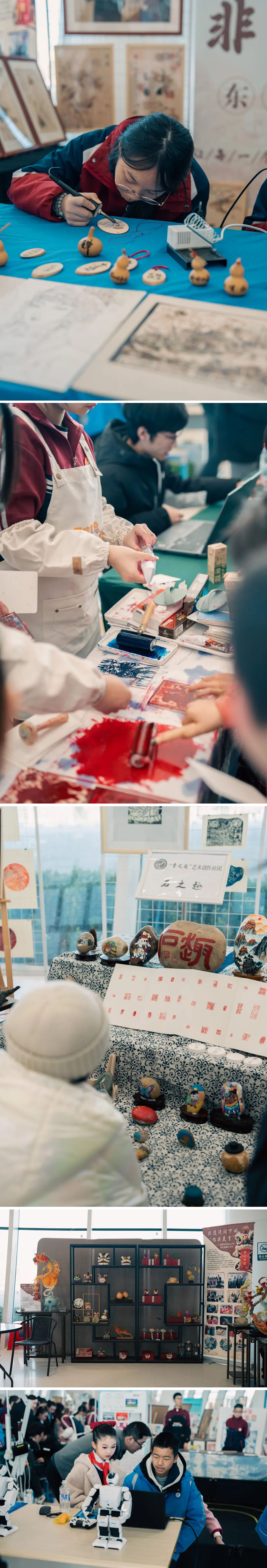 舞台之外,非遗与传统艺术工作坊人气爆棚。烙画的焦墨生香、手工扎染的靛蓝晕染、剪纸的指尖飞花、面塑的惟妙惟肖、木刻版画的质朴厚重……,一个个特色工作坊让静态艺术活起来,学生们沉浸式体验传统技艺,在动手实践中感受中华优秀传统文化魅力,尽显鄂州校园美育“一校一品”特色。