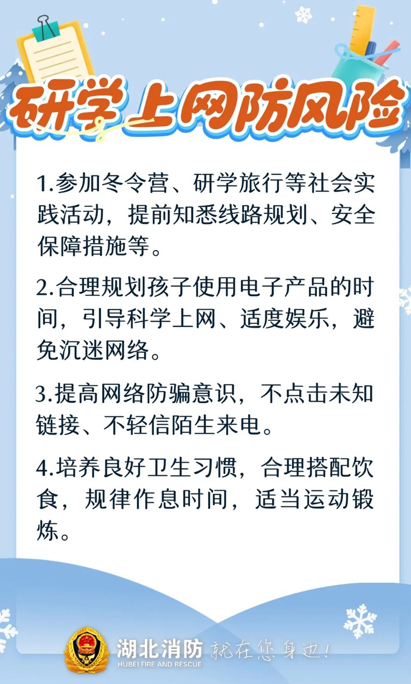 2026年寒假将至,孩子们将陆续开启寒假模式,时值冬季,又临春节。在享受快乐假期的同时,也要紧绷安全弦,谨慎用火用电、注意居家安全,遵守交通规则、安全燃放烟花…………