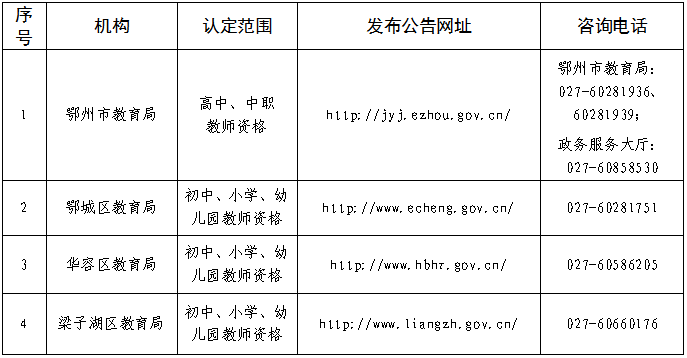 (四)梁子湖区教育局负责户口所在地或居住所在地在梁子湖区的人员申报认定初中、小学、幼儿园教师资格。
